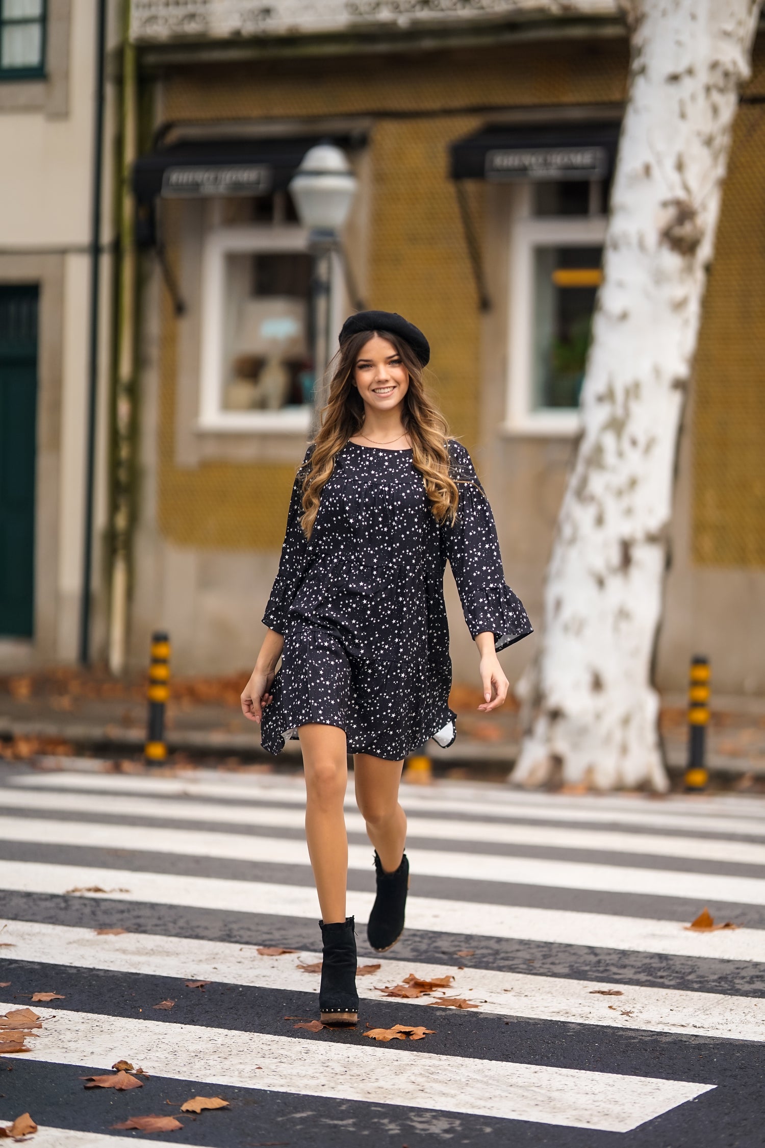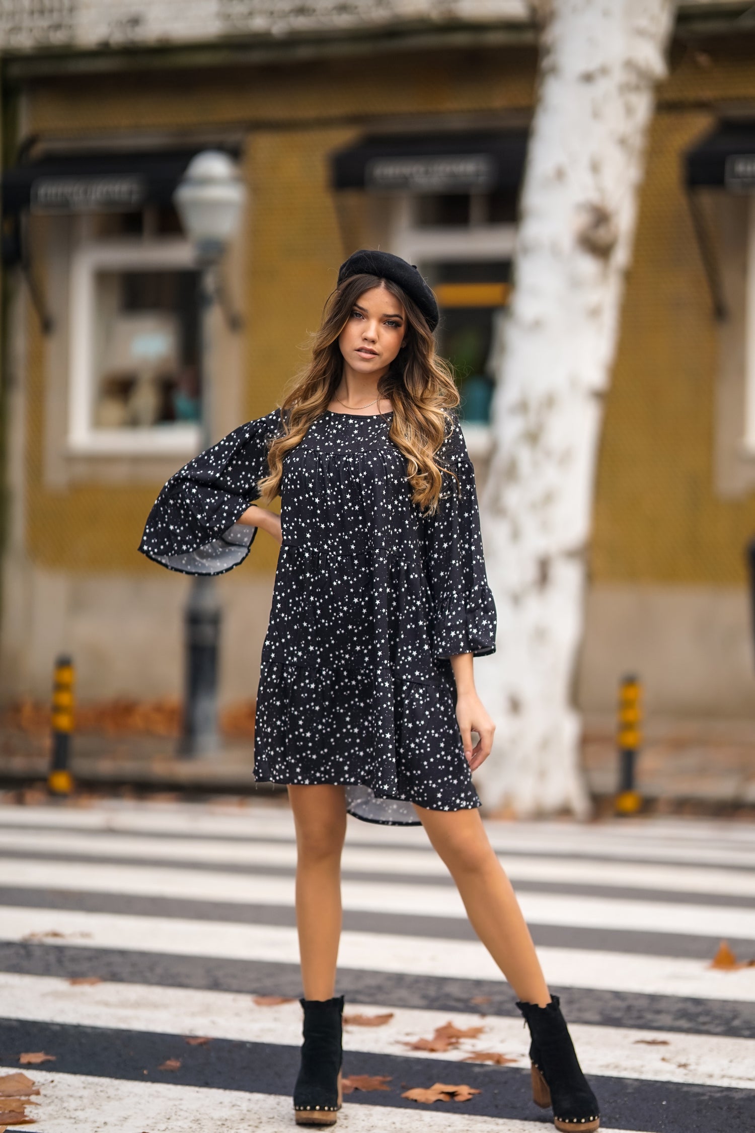 Vestido corto con volantes en tejido de estrellas.