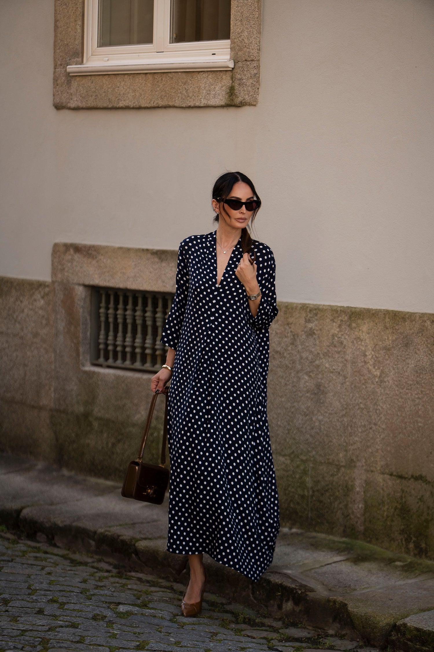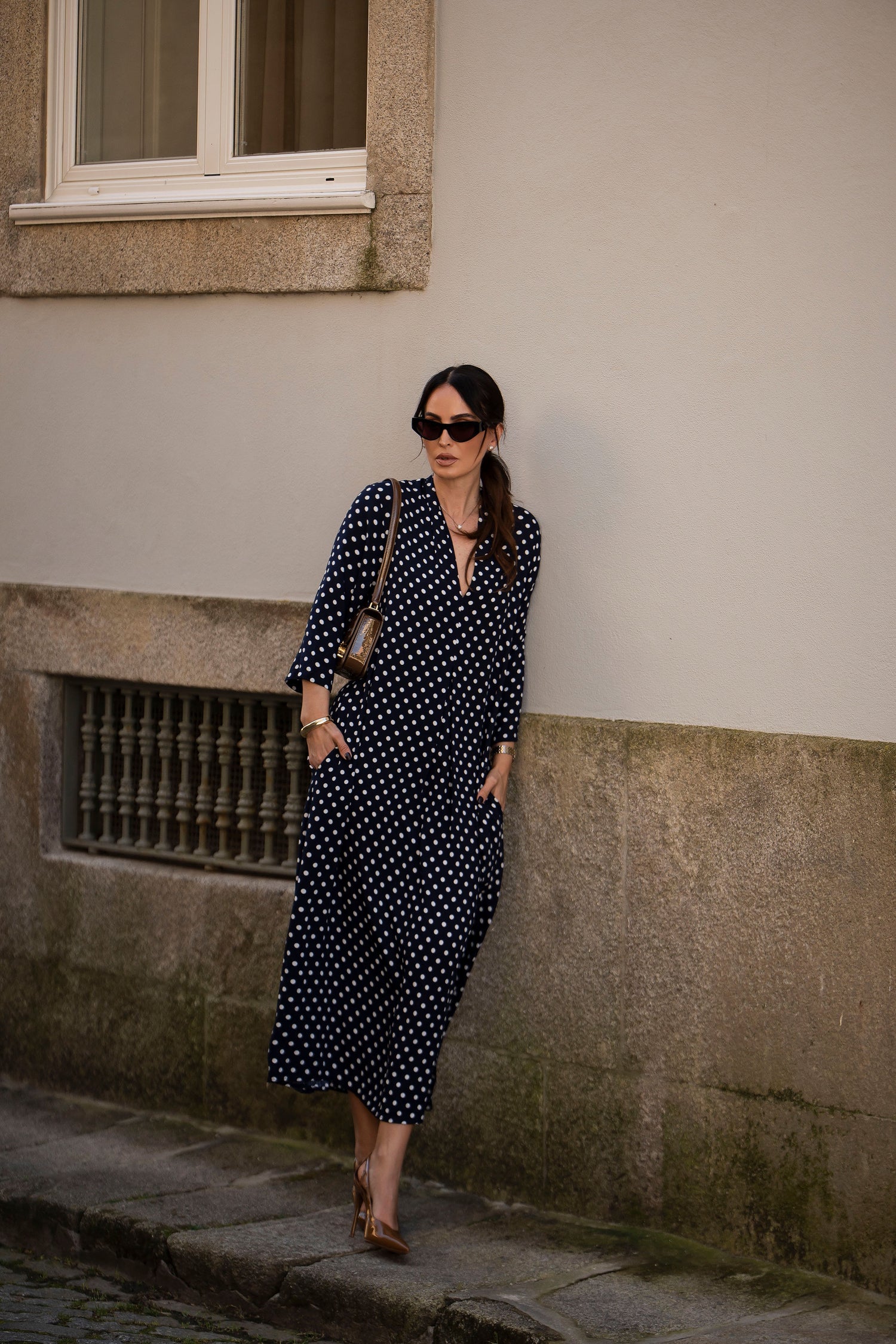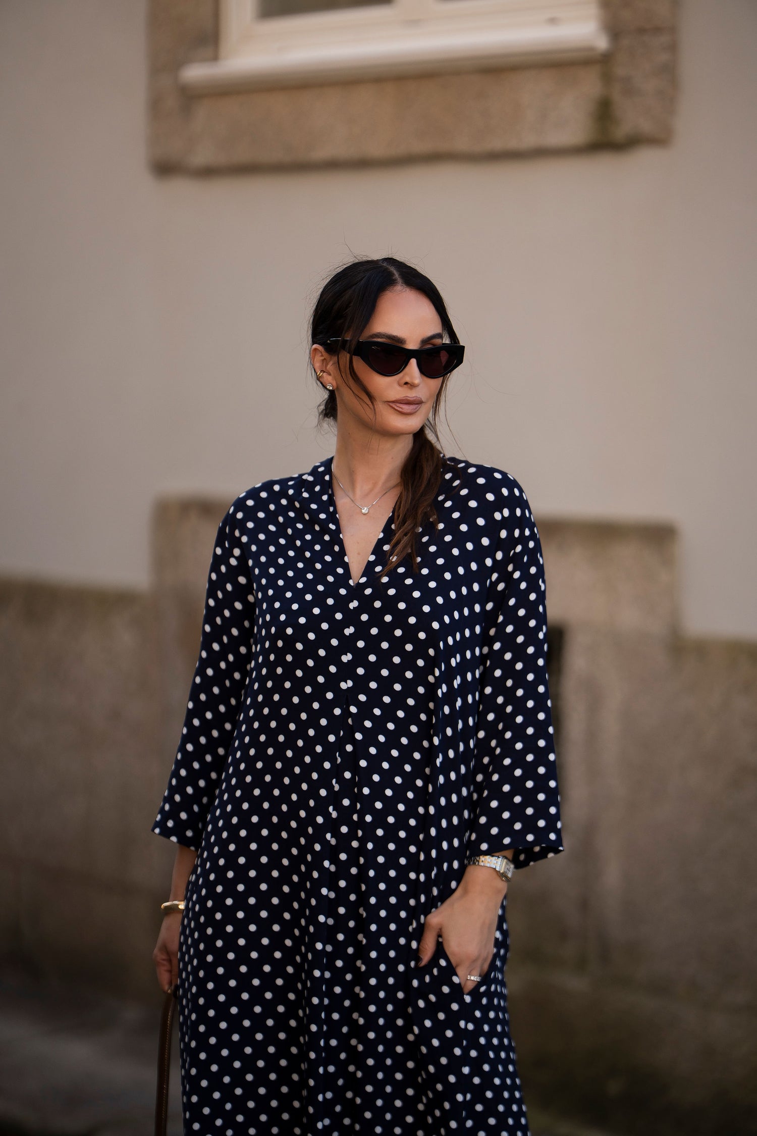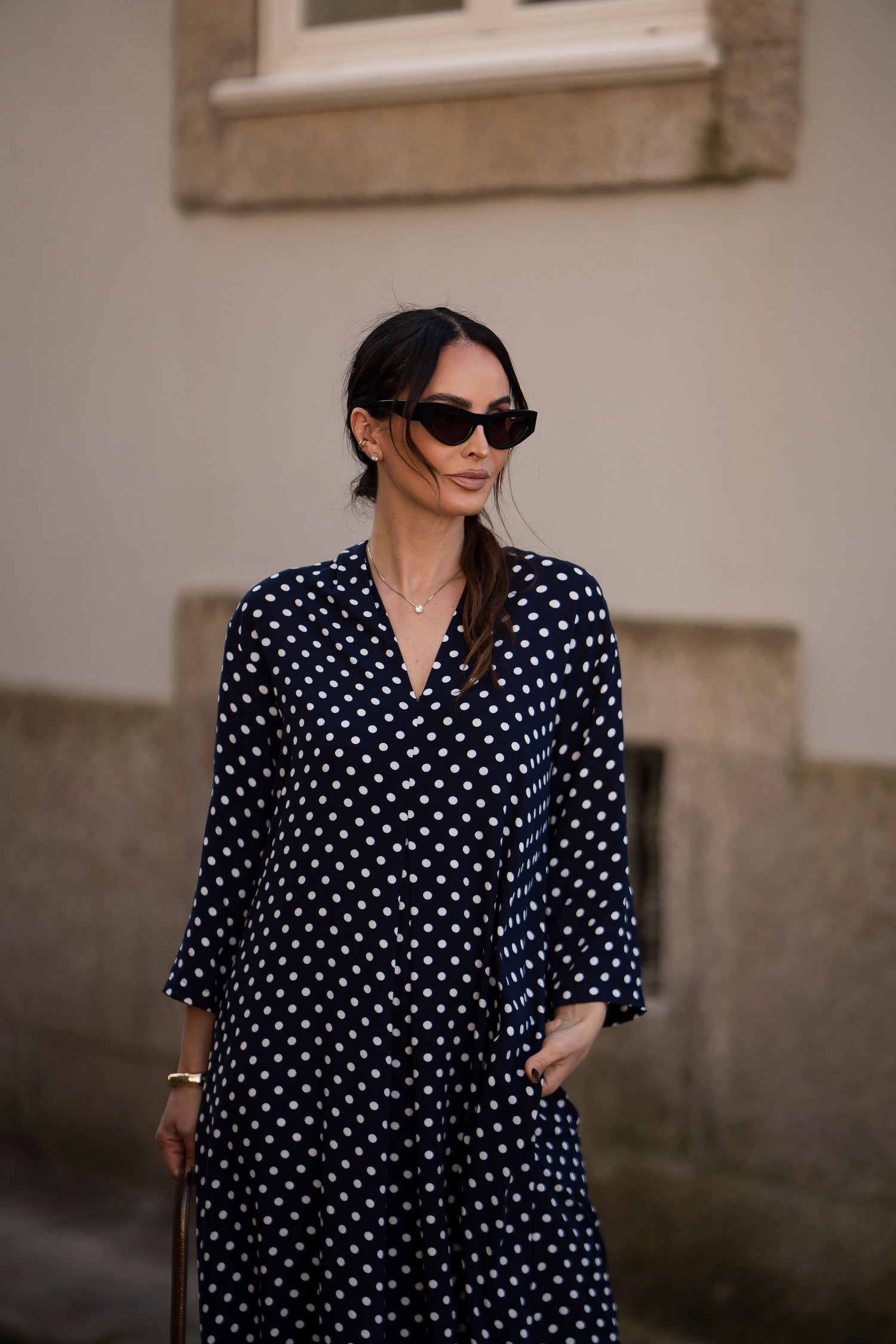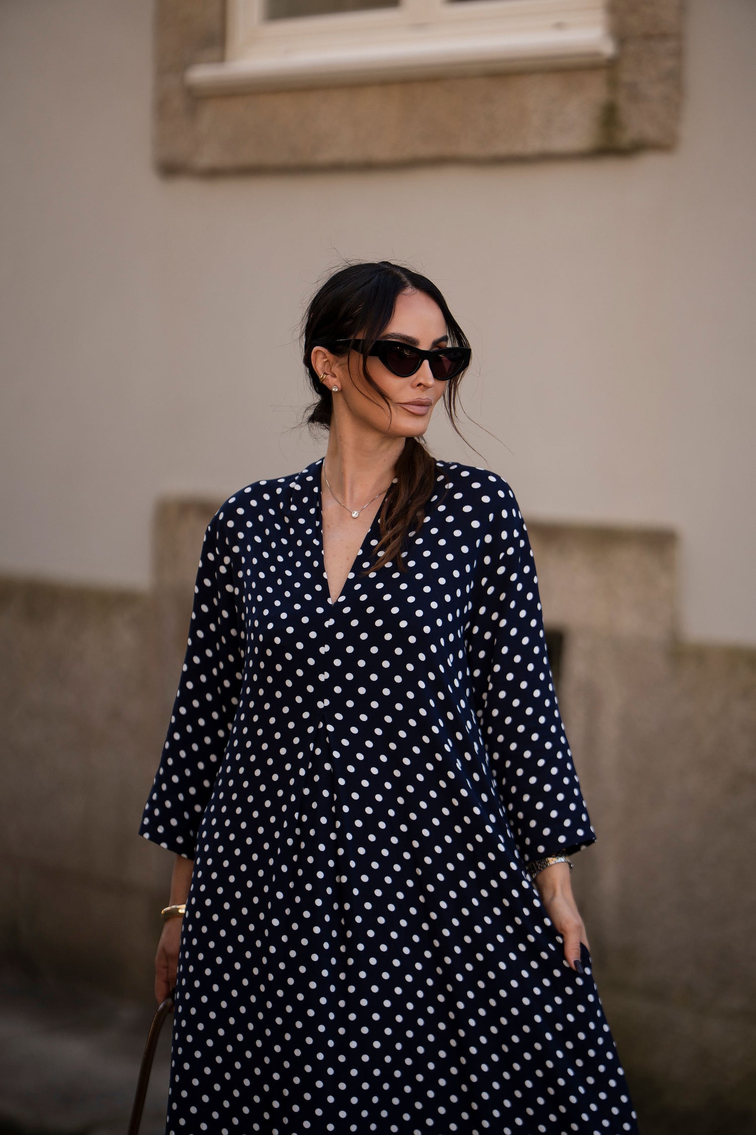 - En viscosa estampada (fondo azul y puntos blancos)