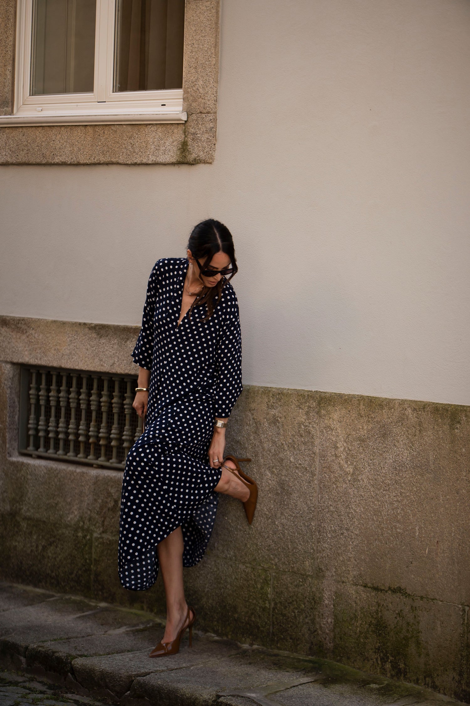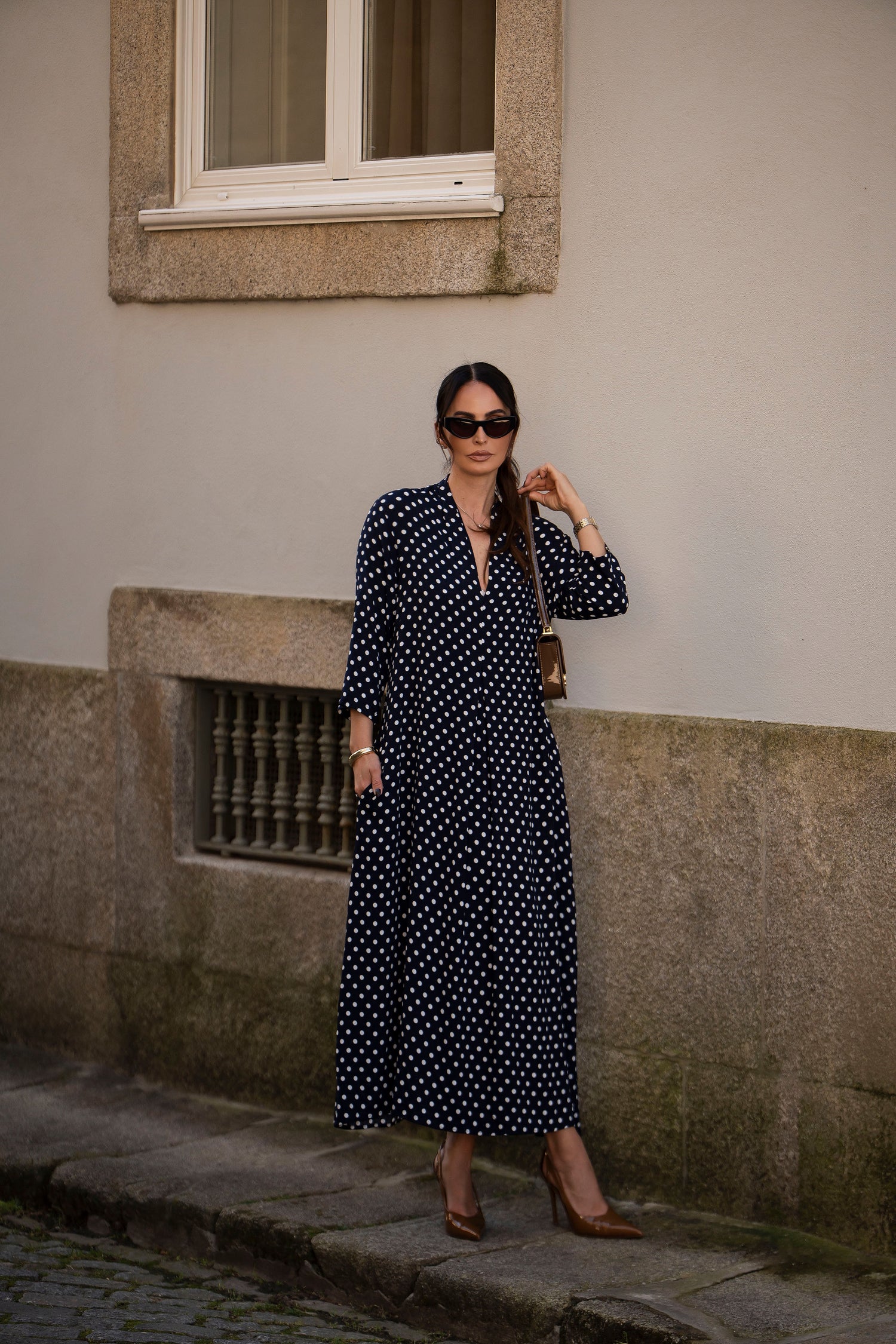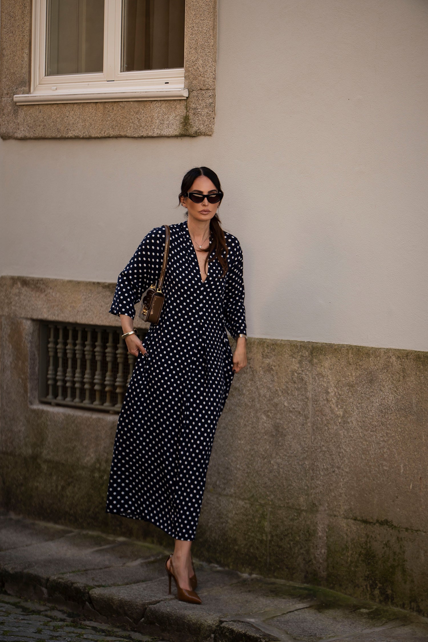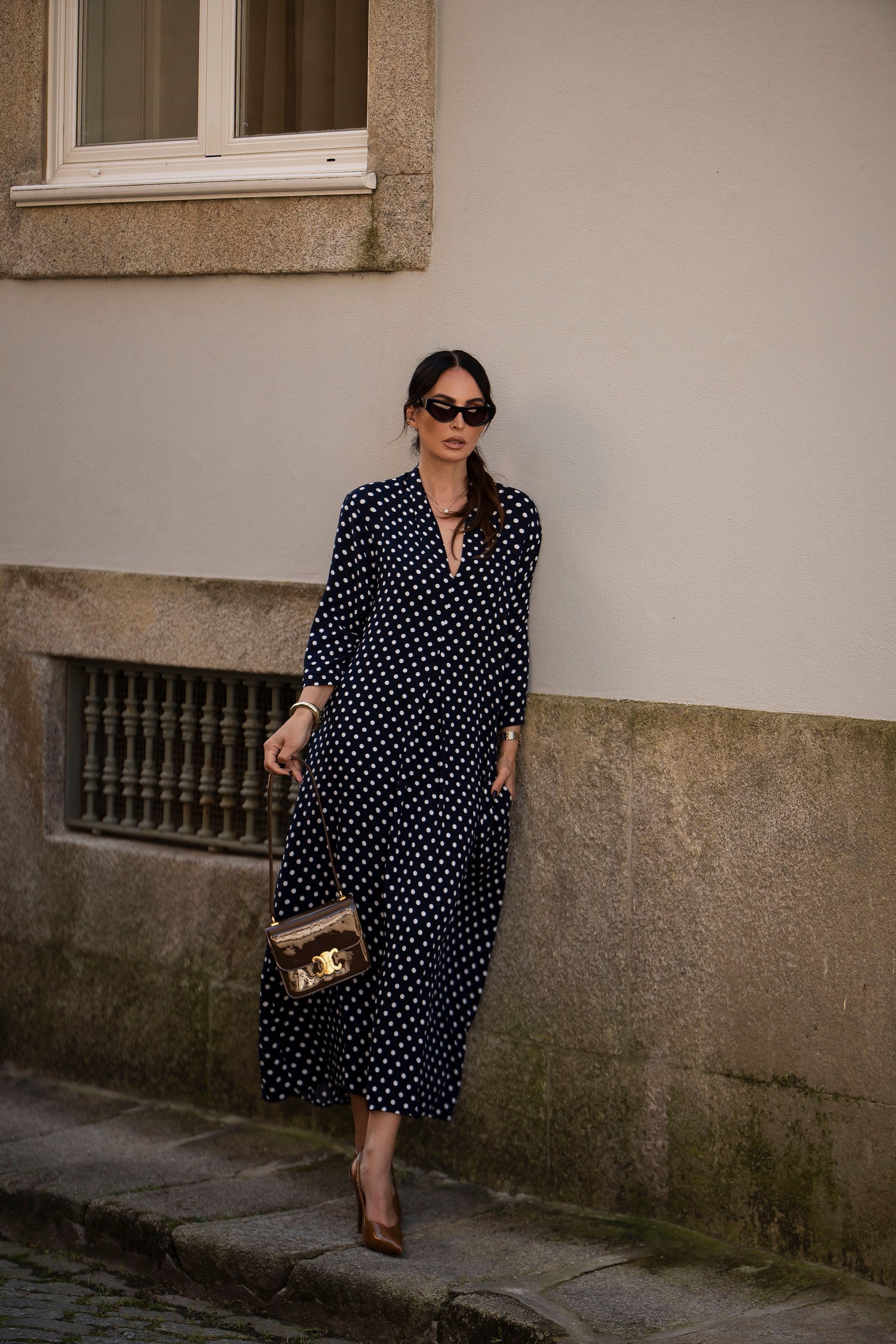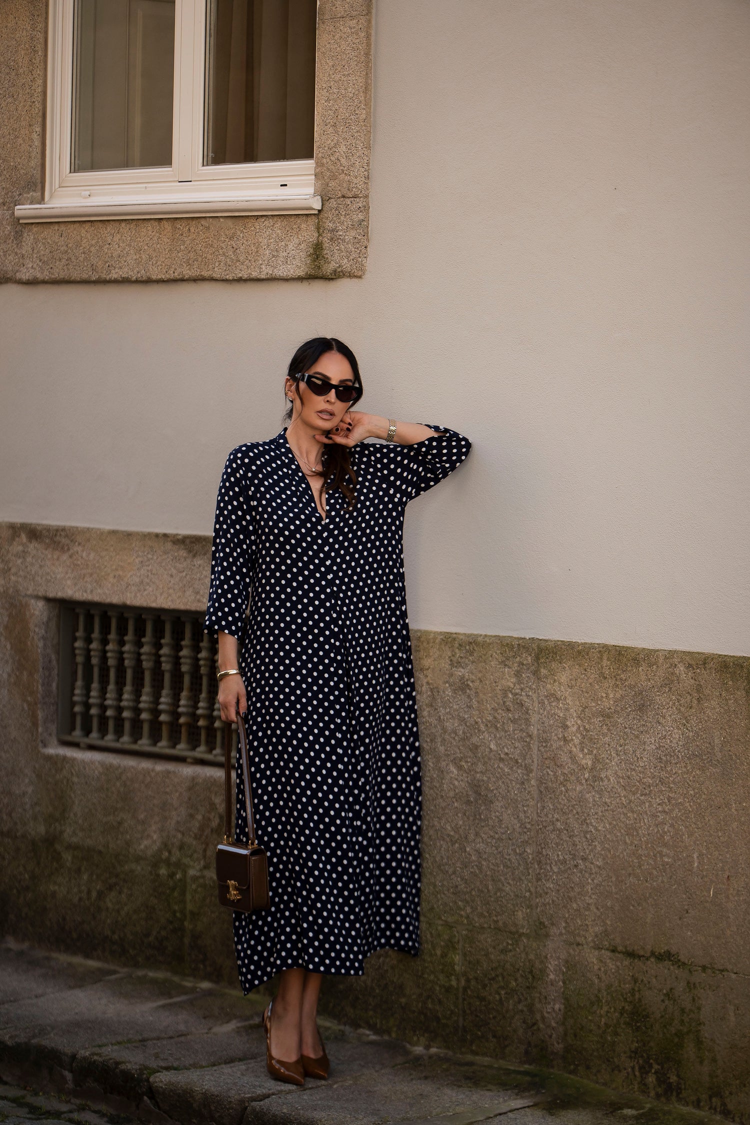 - En viscosa estampada (fondo azul y puntos blancos)