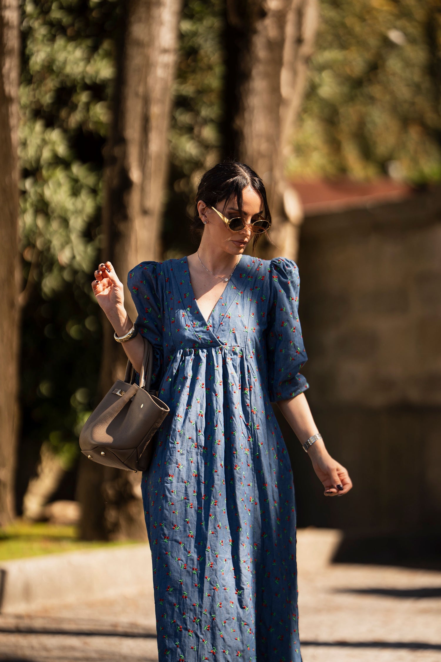 - En tejido viscosa vaquero con bordado de cerezas